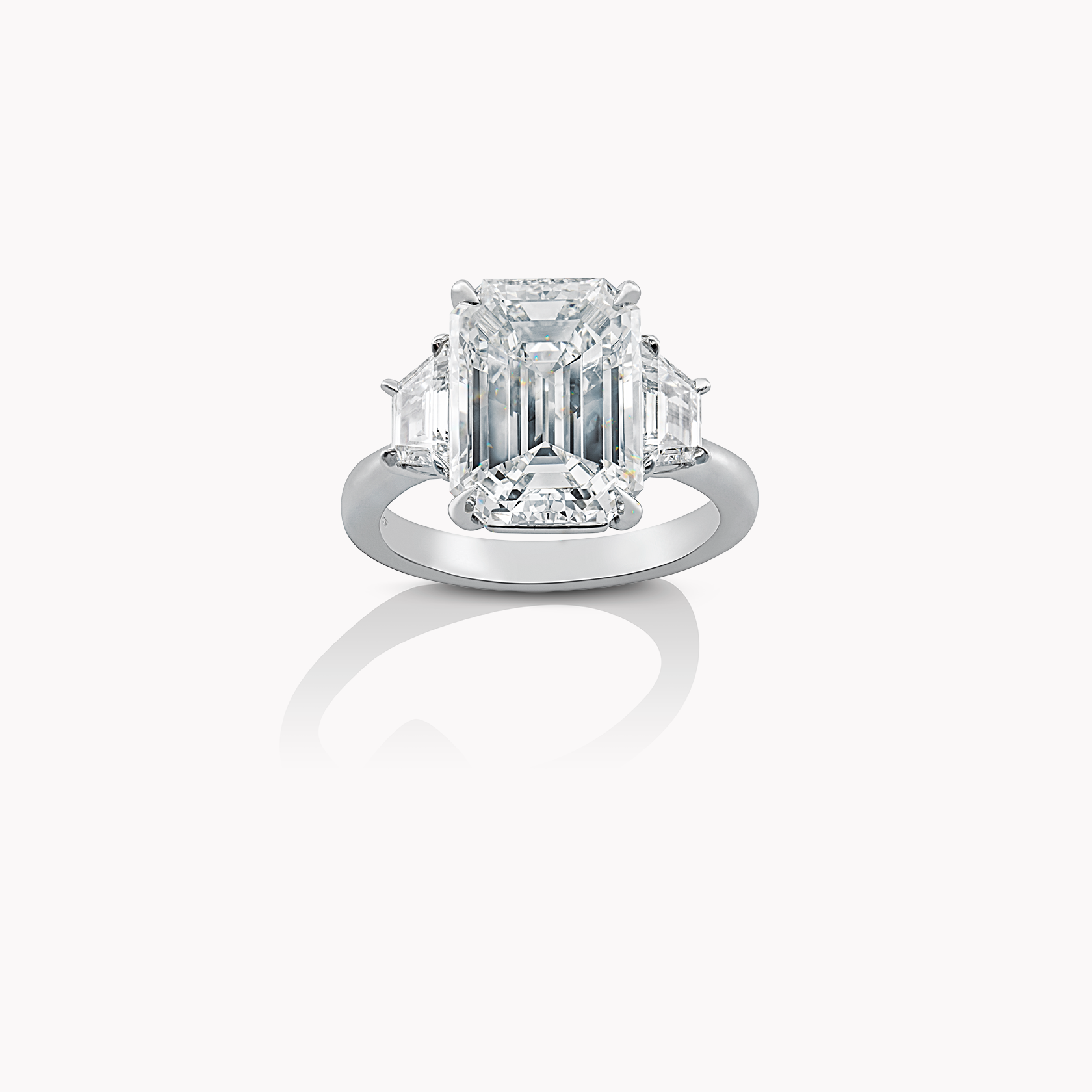 Featuring two dazzling stones expertly chosen and cut to frame a 6.01 carats emerald cut diamond for maximum radiance, this shared setting design allows for ultimate brilliance and shine while maintaining a classic look.