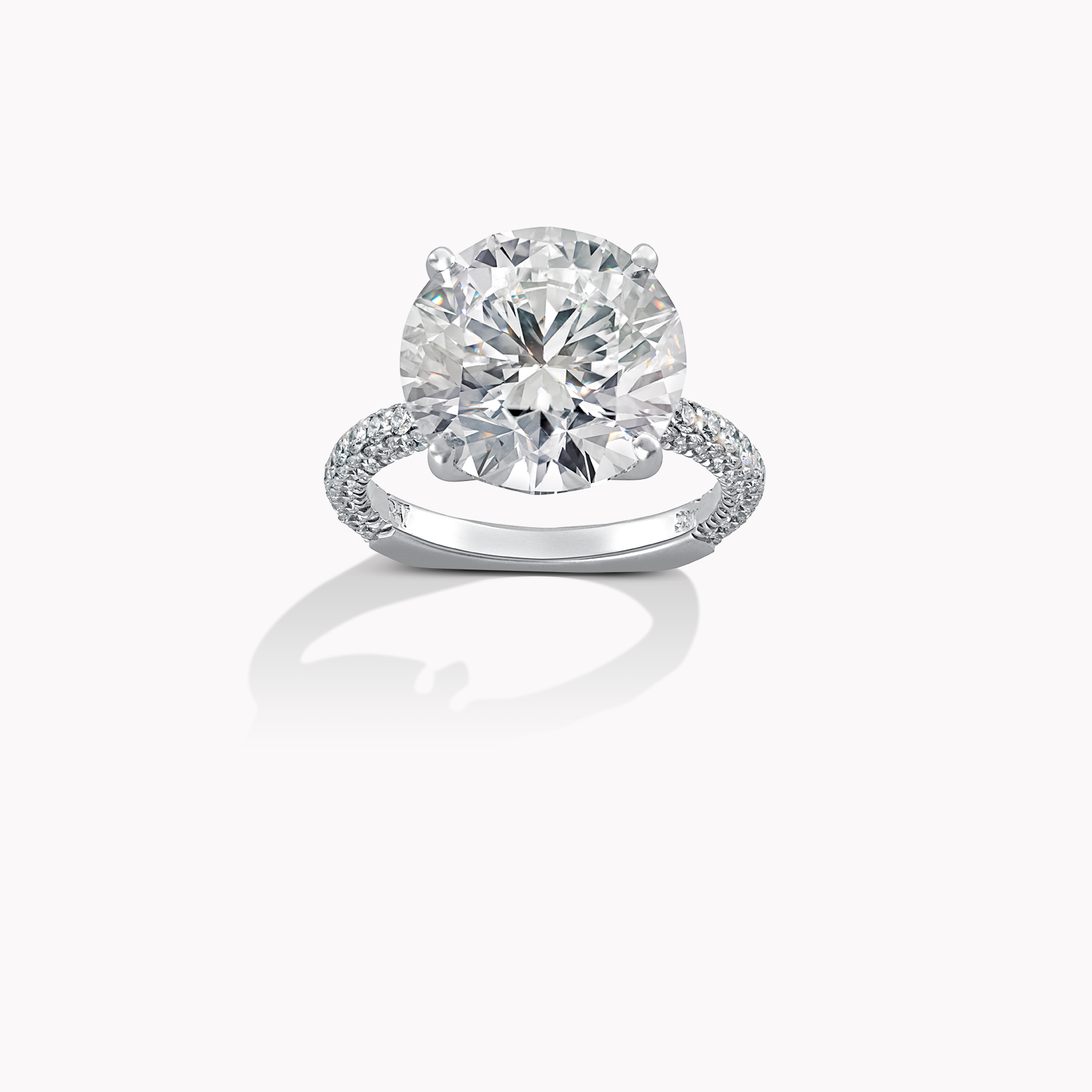 Simple and elegant but still outstanding. Ornate your loved one's hand with an 8.35 carats round brilliant cut diamond centring a pave-set, white gold diamond band. Masterly made, the four-prong setting situates the diamond above the band, showcasing the eternal brilliance of the stone.