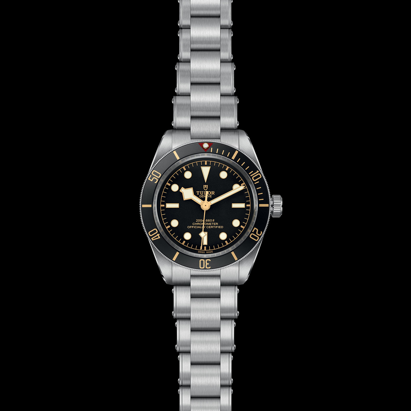 Steel screw-down winding crown, with the TUDOR rose in relief, with circular satin-brushed steel winding crown tube