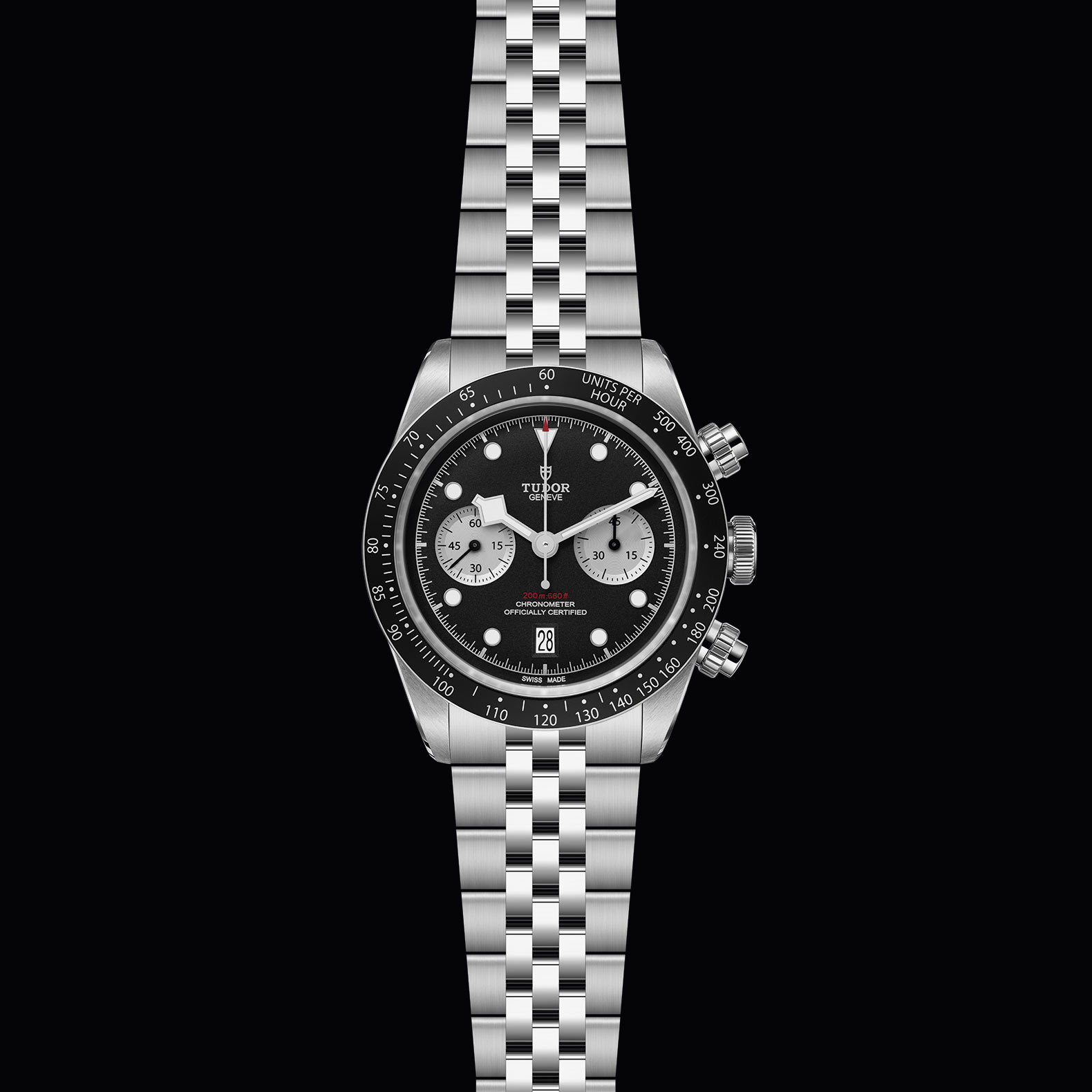 Stainless steel screw-down winding crown with the TUDOR rose in relief Stainless steel screw-down pushers at 2 o'clock and 4 o'clock