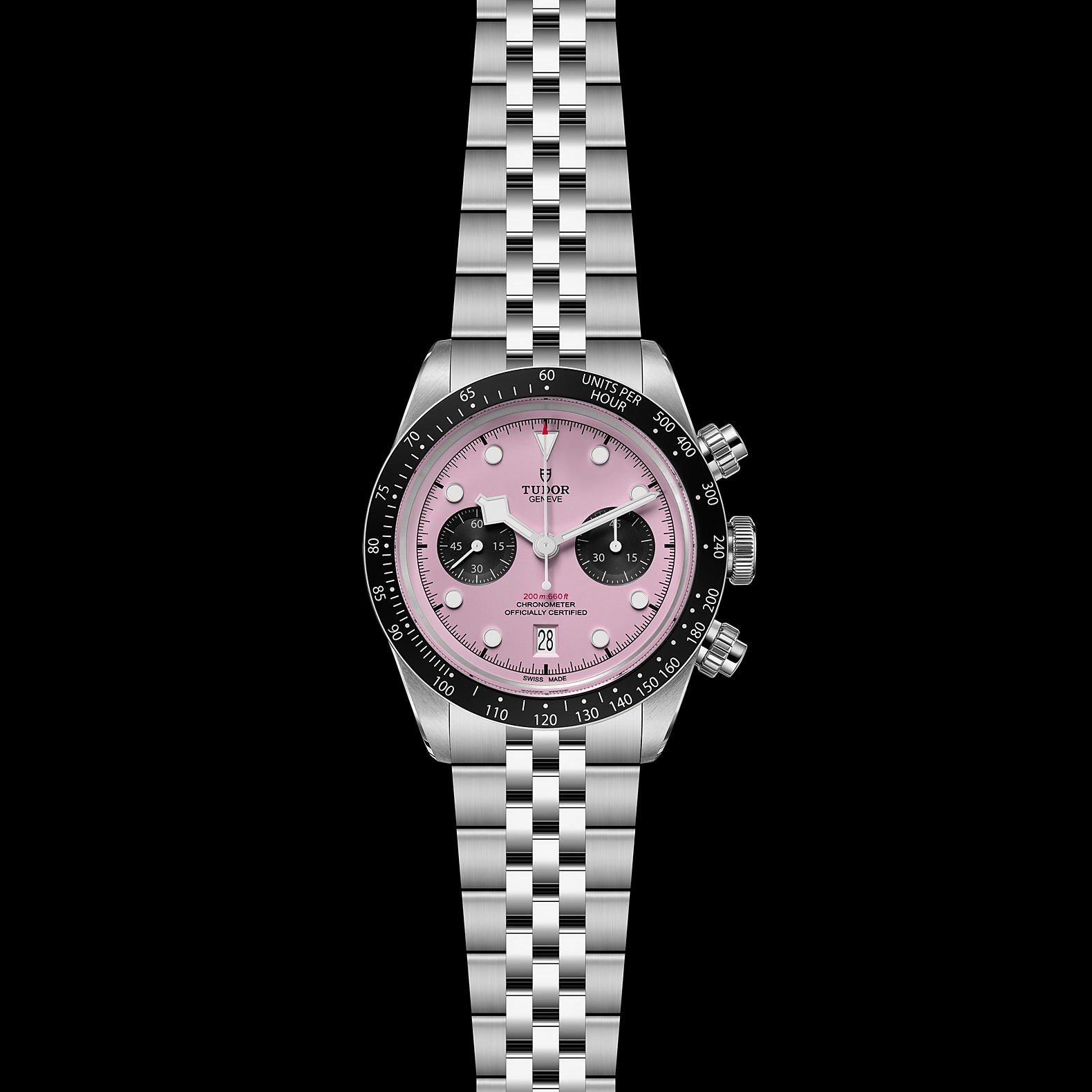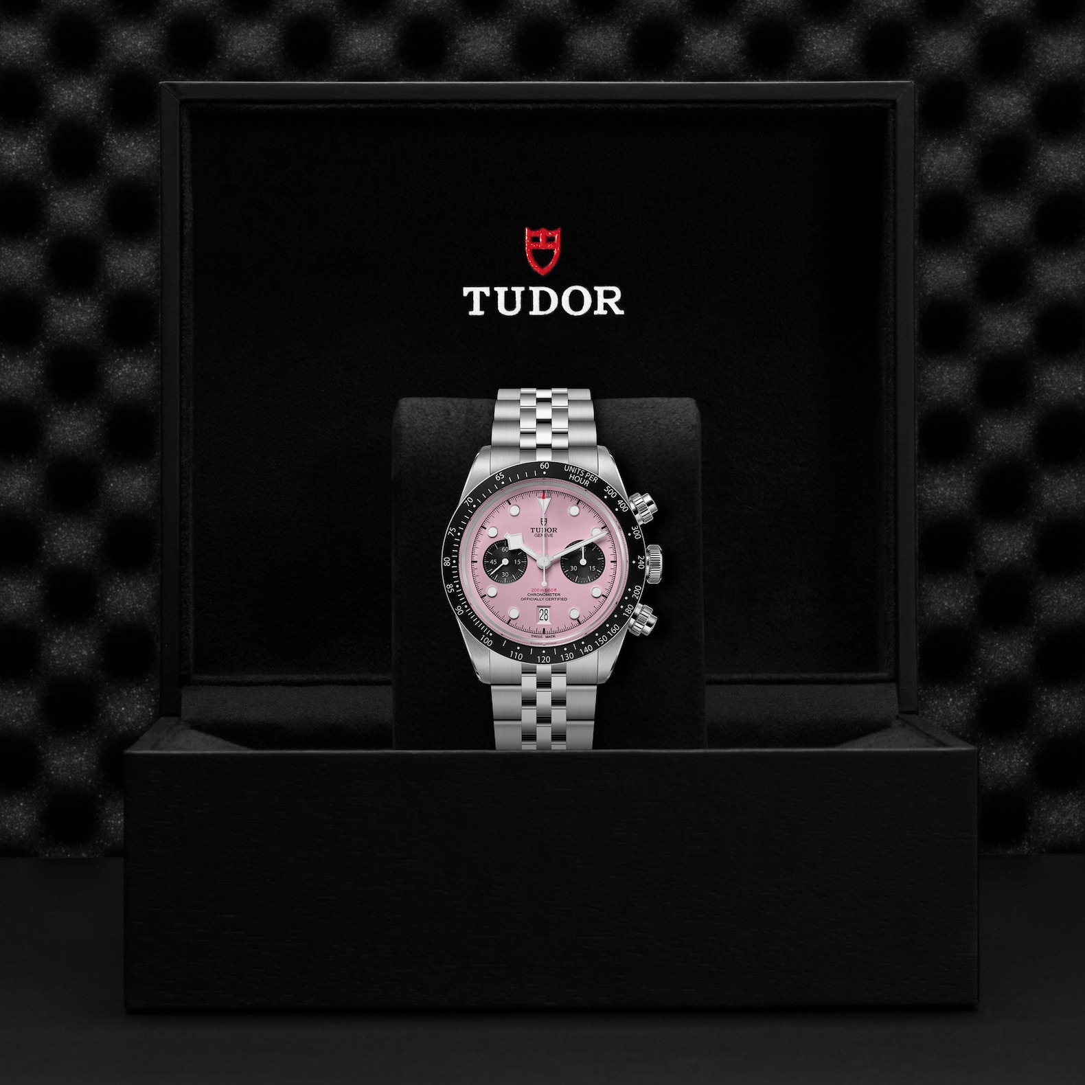 Stainless steel screw-down winding crown with the TUDOR rose in relief Stainless steel screw-down pushers at 2 o'clock and 4 o'clock