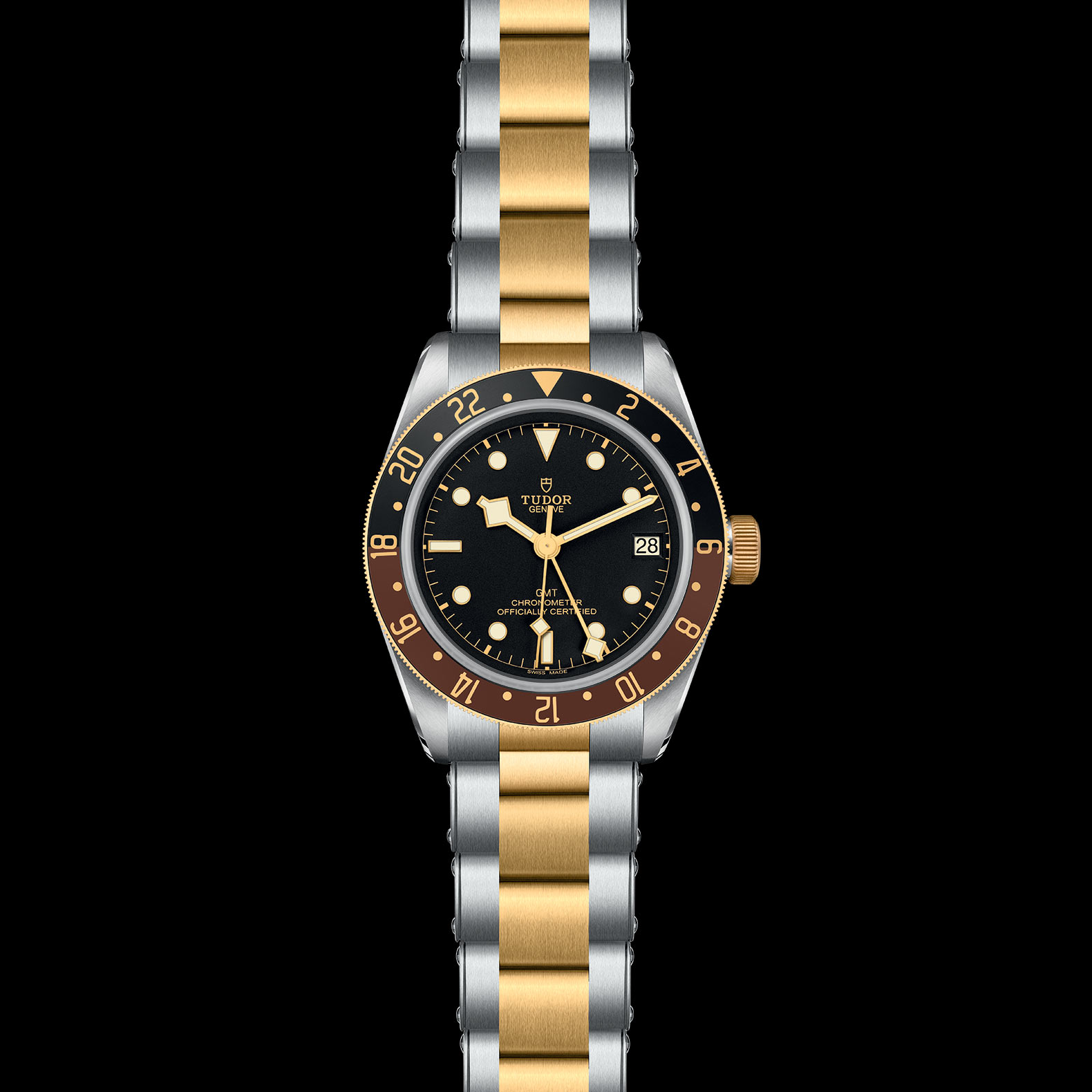 Screw-down winding crown, with the TUDOR rose engraved and lacquered in black, with black anodised aluminium winding crown tube. Steel covered by a 0.3mm yellow gold cap