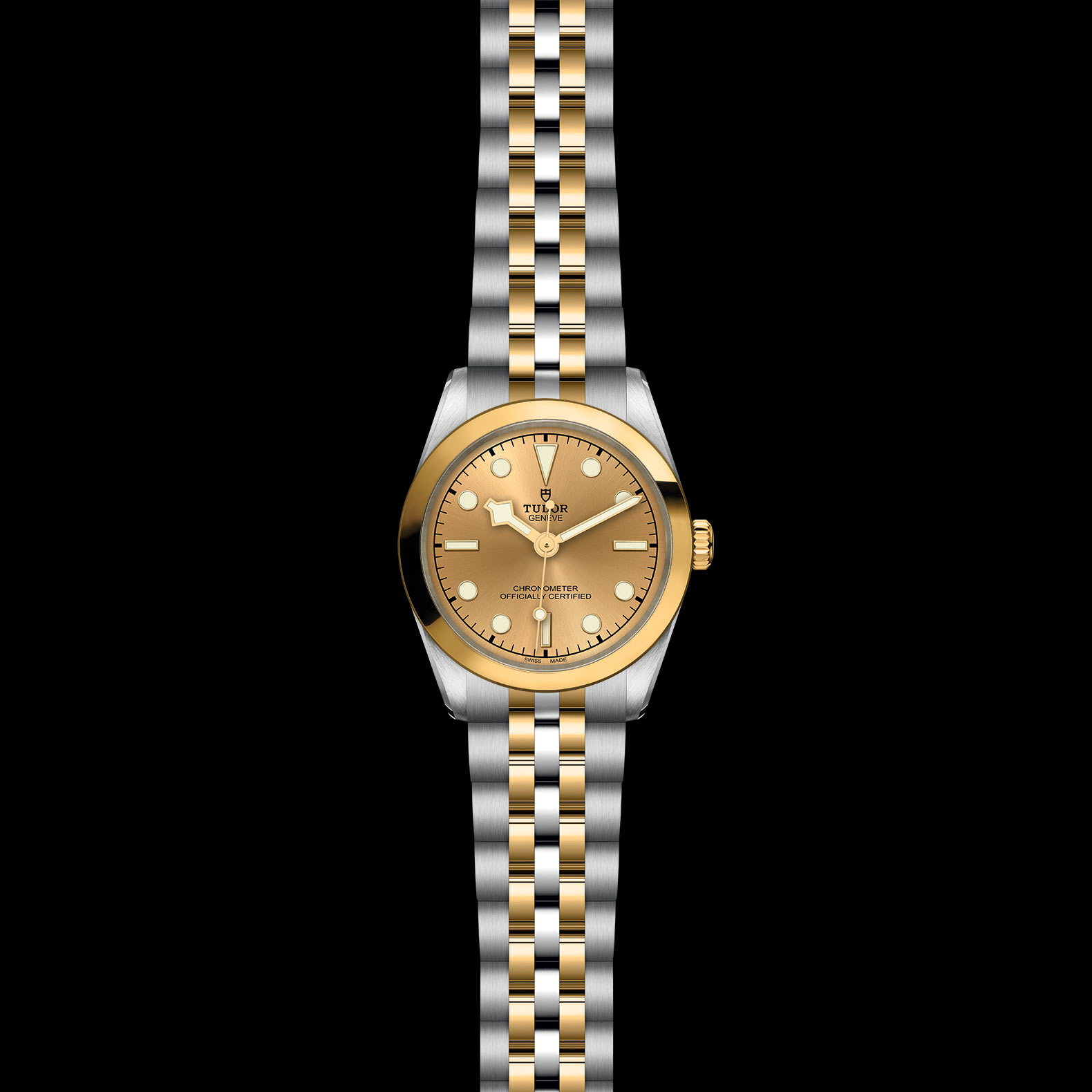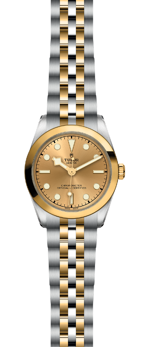 First center links in steel or solid yellow gold. Remaining center links in steel or steel covered by a 0.2mm yellow gold cap. TUDOR "T-fit" folding clasp with safety catch. The logo on the catch is made of solid yellow gold