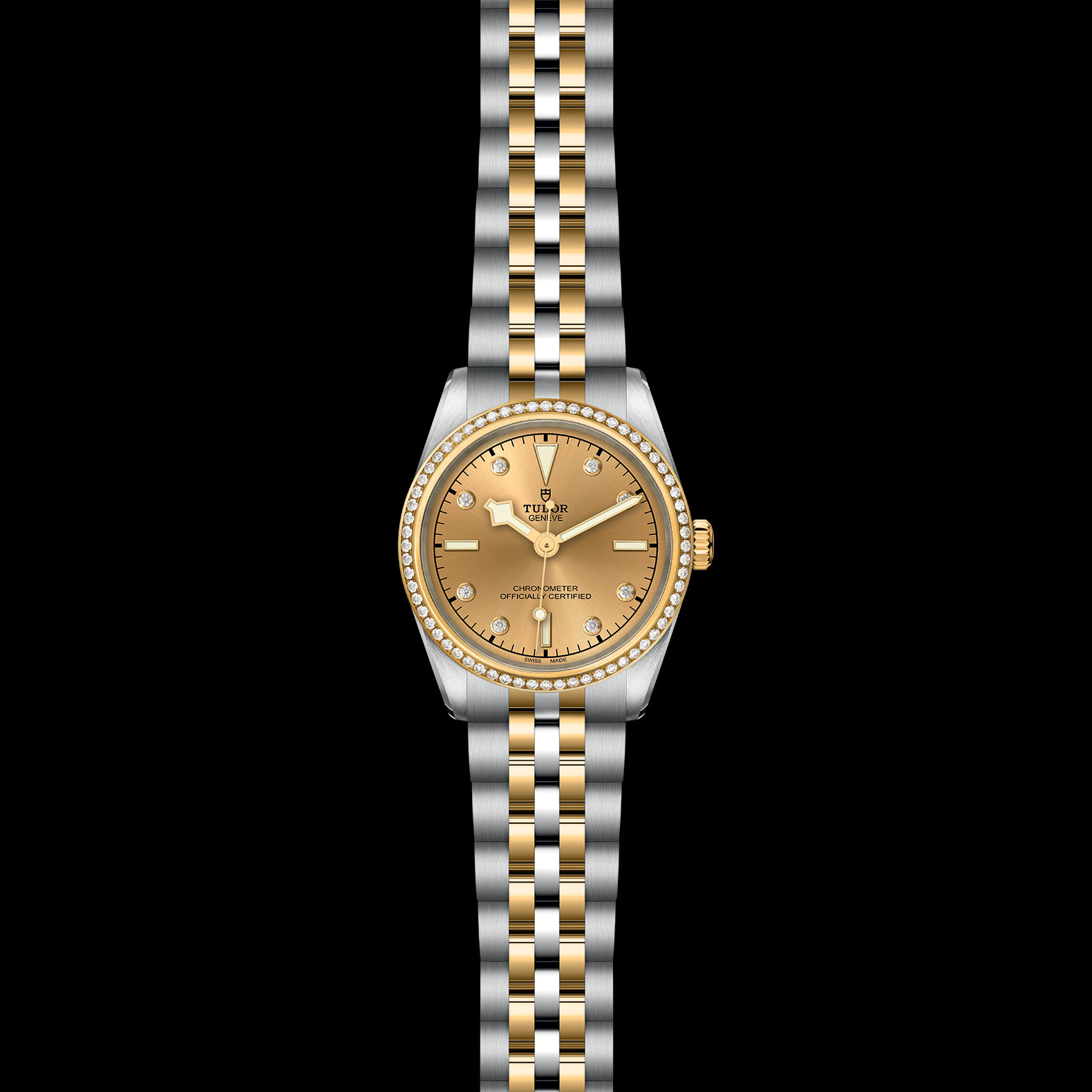 First center links in steel or solid yellow gold. Remaining center links in steel or steel covered by a 0.2mm yellow gold cap. TUDOR "T-fit" folding clasp with safety catch. The logo on the catch is made of solid yellow gold