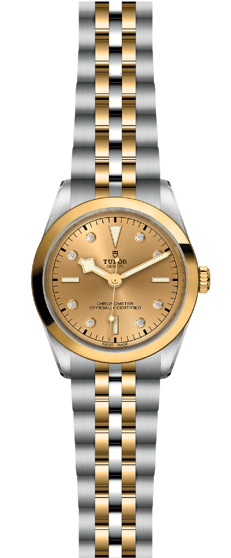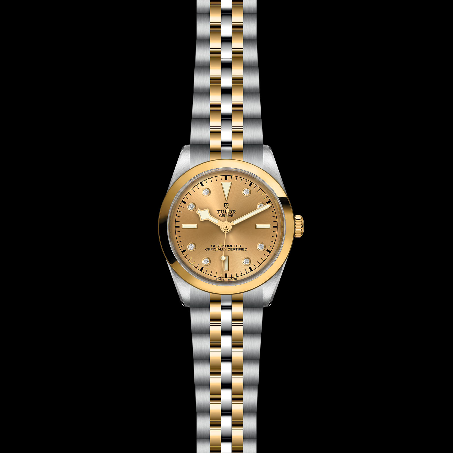First center links in steel or solid yellow gold. Remaining center links in steel or steel covered by a 0.2mm yellow gold cap. TUDOR "T-fit" folding clasp with safety catch. The logo on the catch is made of solid yellow gold