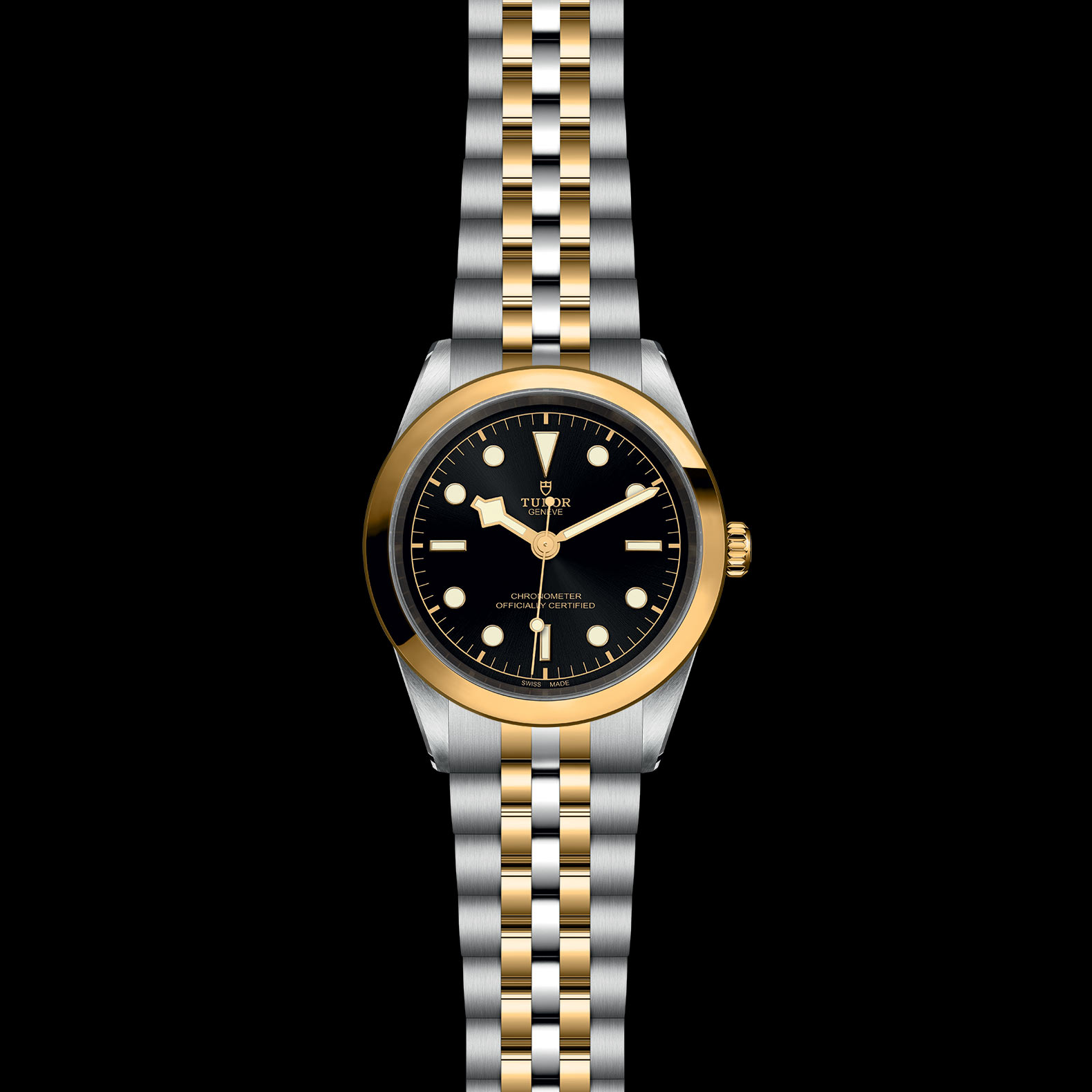 First center links in steel or solid yellow gold. Remaining center links in steel or steel covered by a 0.2mm yellow gold cap. TUDOR "T-fit" folding clasp with safety catch. The logo on the catch is made of solid yellow gold