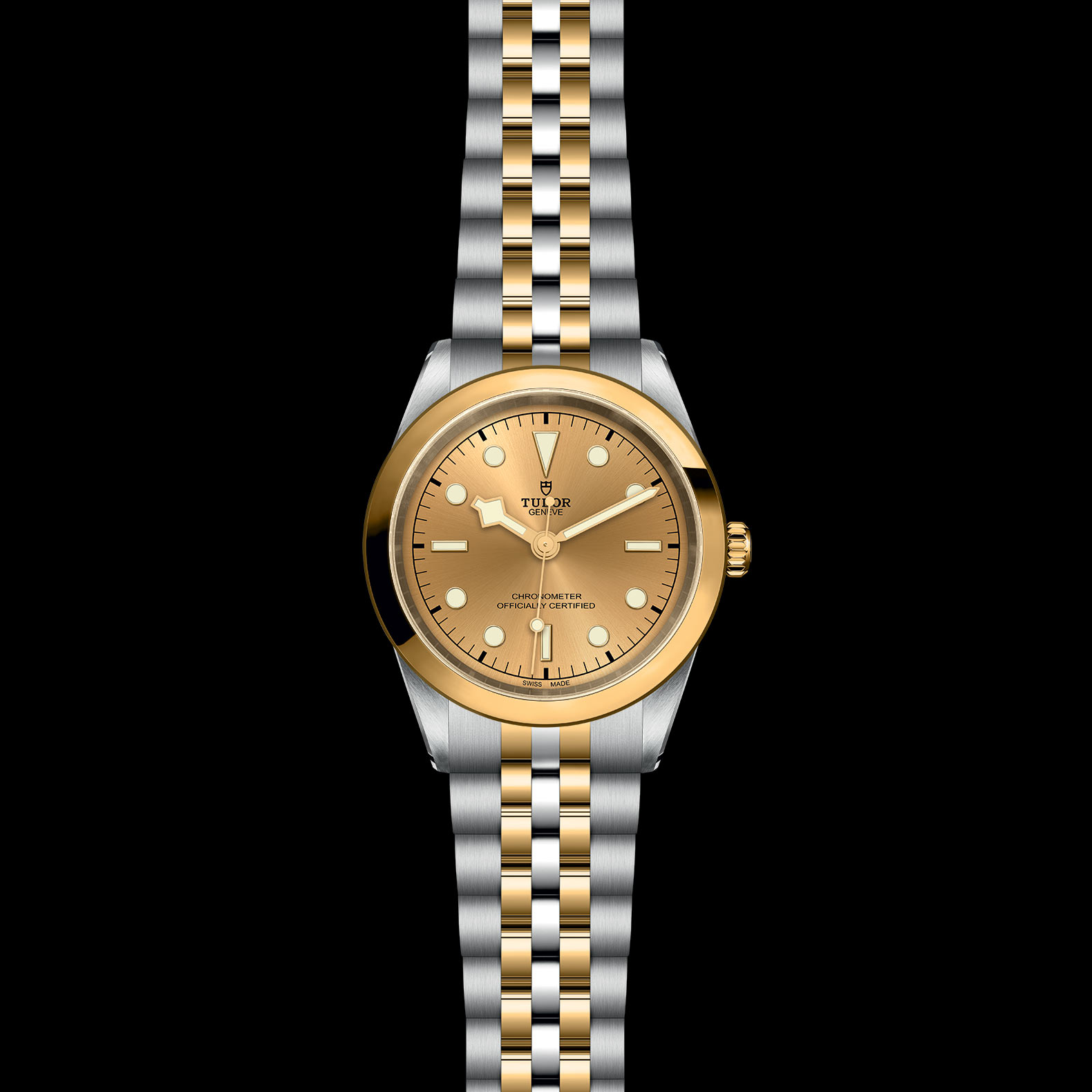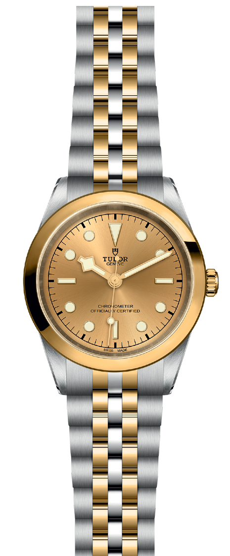 First center links in steel or solid yellow gold. Remaining center links in steel or steel covered by a 0.2mm yellow gold cap. TUDOR "T-fit" folding clasp with safety catch. The logo on the catch is made of solid yellow gold