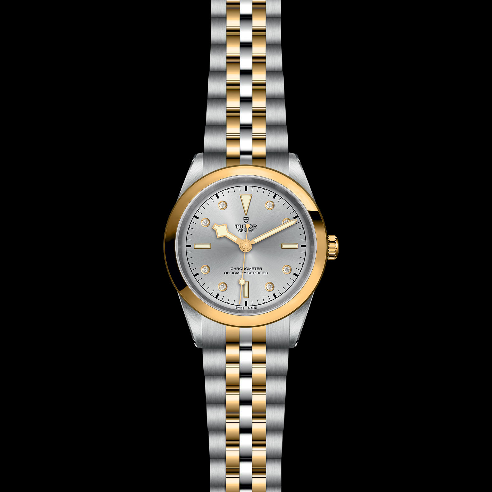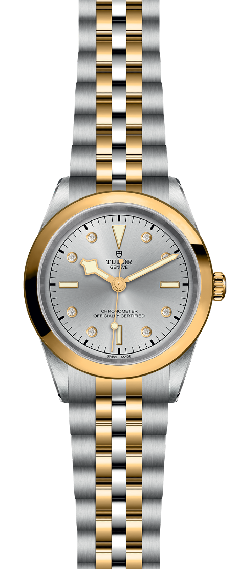 First center links in steel or solid yellow gold. Remaining center links in steel or steel covered by a 0.2mm yellow gold cap. TUDOR "T-fit" folding clasp with safety catch. The logo on the catch is made of solid yellow gold