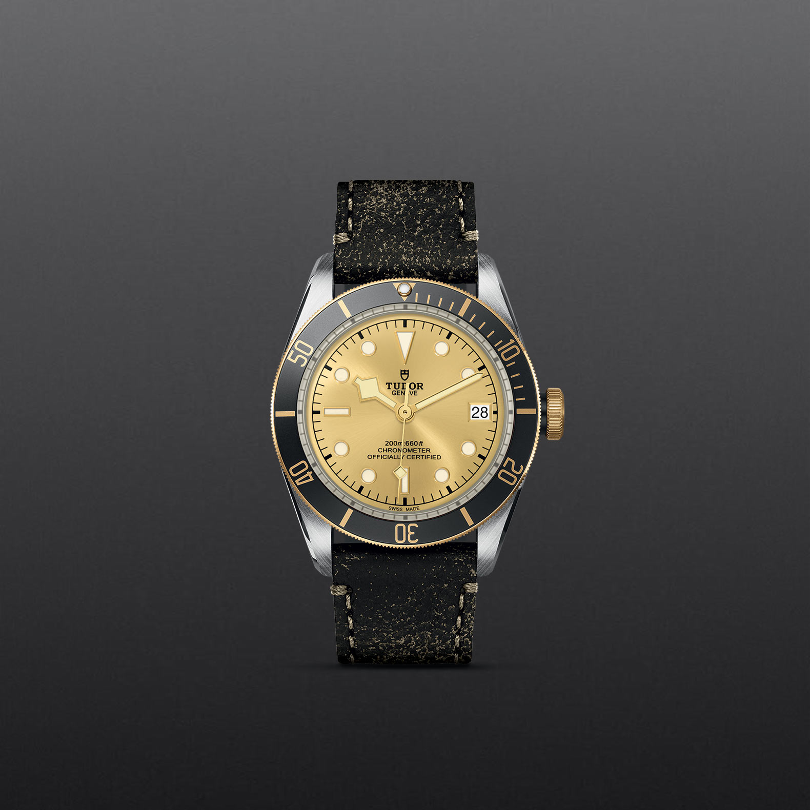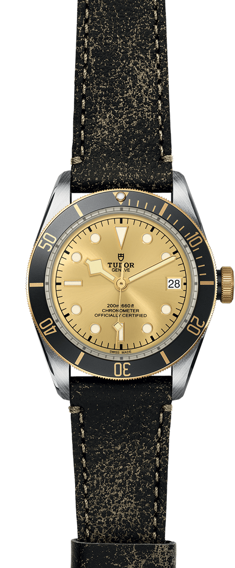 Screw-down winding crown, with the TUDOR rose engraved and lacquered in black, with black anodised aluminium winding crown tube. Steel covered by a 0.3mm yellow gold cap