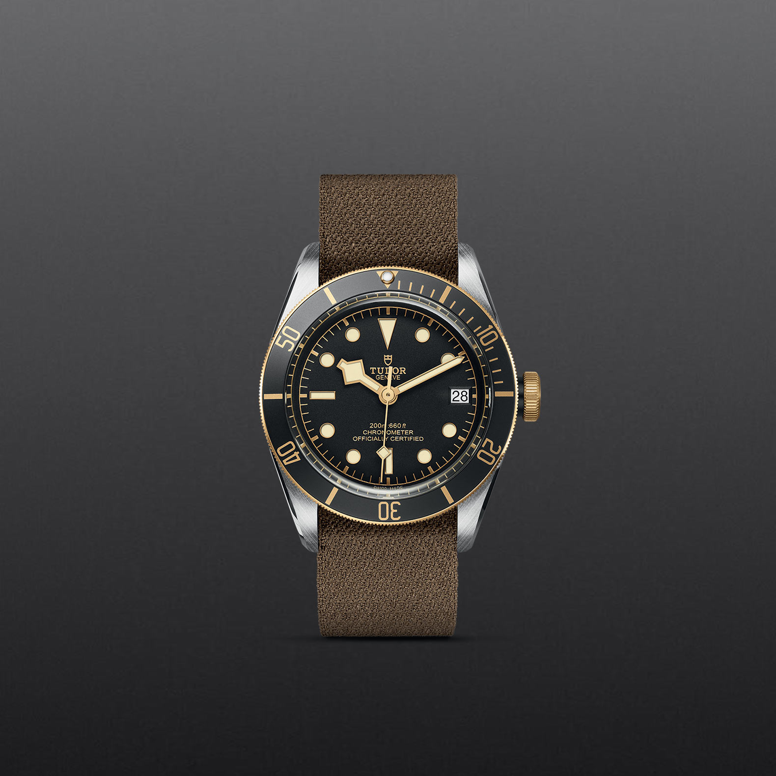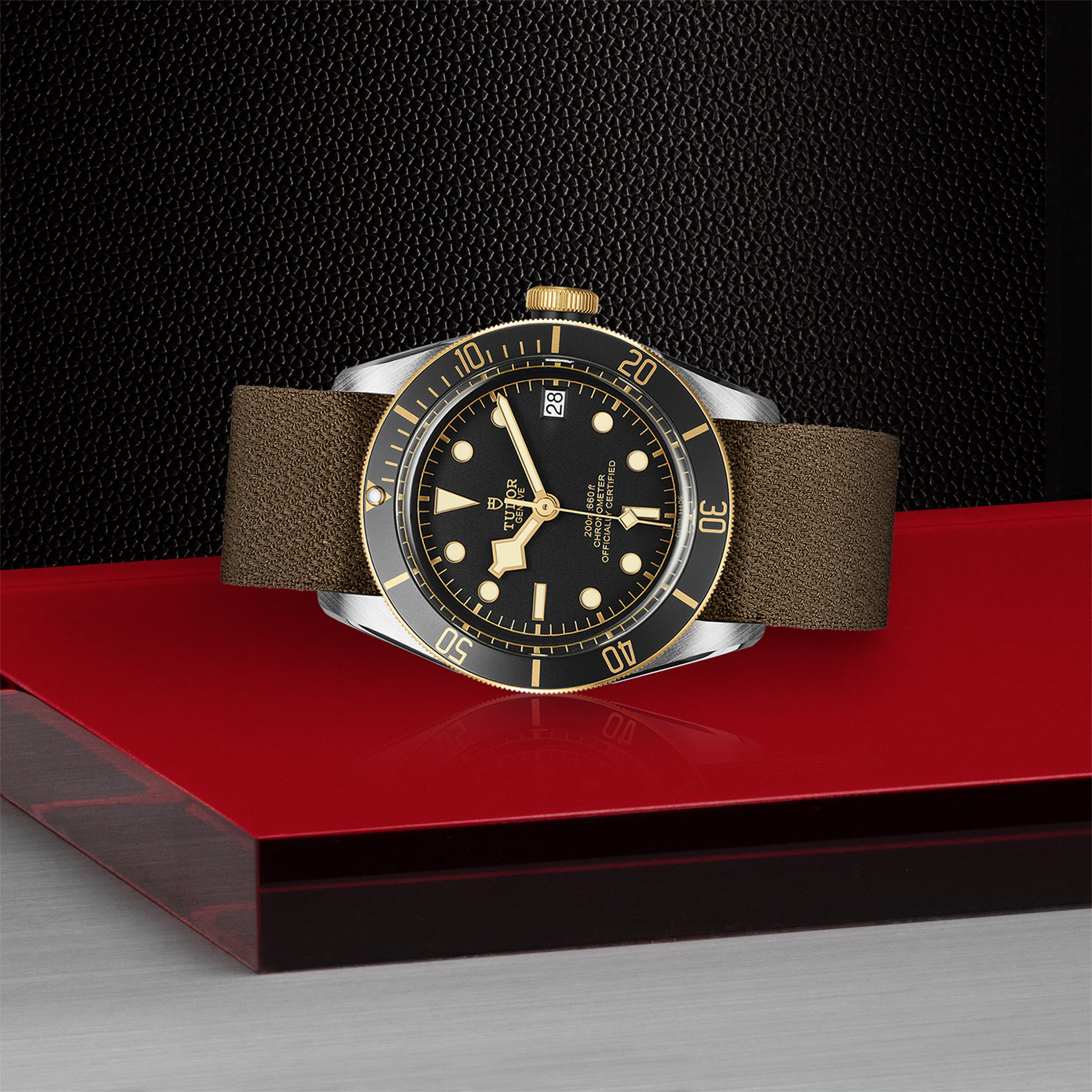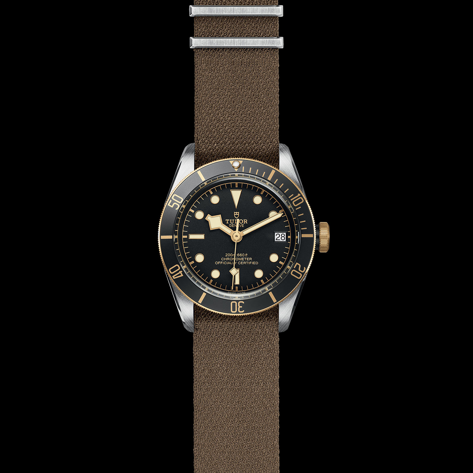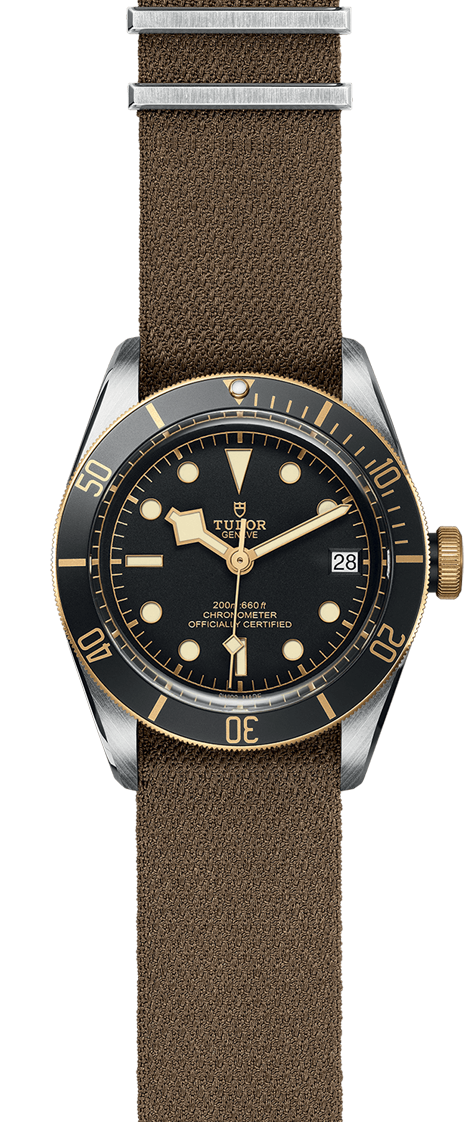 Screw-down winding crown, with the TUDOR rose engraved and lacquered in black, with black anodised aluminium winding crown tube. Steel covered by a 0.3mm yellow gold cap