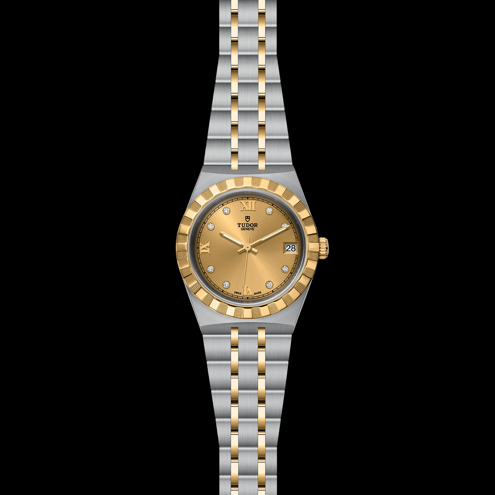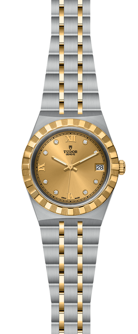Screw-down winding crown with the TUDOR logo. Steel covered by a 0.1mm yellow gold cap
